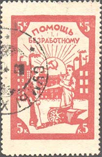 1924(?) г. Разм. рамки 29 х 43 мм. Одноцветная печать на белой (оттенки) бумаге. Зубц. 11 1/2. В прямоугольной рамке в центре рабочий протягивает руку безработному на фоне заводских корпусов и восходящего солнца с серпом и молотом в центре. Сверху текст: «Помощь безработному». По углам номинал.