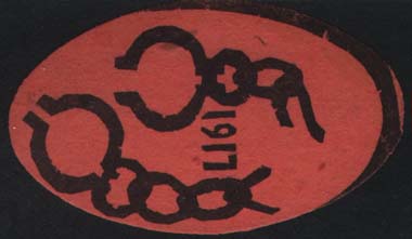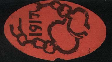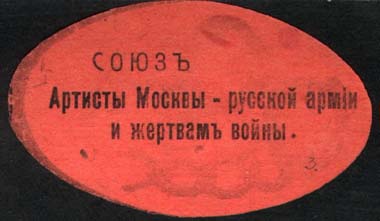 1917 г. Овал разм. 60 х 36 мм. Одноцветная двухсторонняя печать на розово-красной бумаге. На лицевой стороне текст в три строки: «Союз Артисты Москвы - русской армии и жертвам войны». На оборотной стороне разорванные кандалы и дата: «1917». Существует два типа рисунка оборотной стороны.