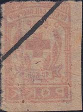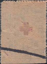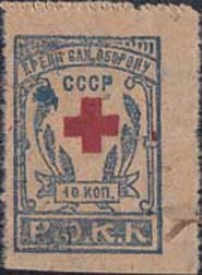 1930(?) г. Одноцветная и двухцветная печать на серой бумаге низкого качества. В рамке сверху текст: «Крепи сан[итарную]. Оборону СССР». В центре красный крест в обрамлении венка из колосьев пшеницы и номинал. Внизу буквы: «Р.О.К.К.».