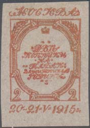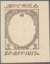 1915 г. 20-21.05.1915 г. Разм. рамки 23 х 27 мм. Двухцветная печать бумаге различных цветов и видов. С клеем и без клея. В рамке в нижних углах номинал. Сверху текст: «Москва». Внизу дата: «20-21.V.1915 г.». Сбор на табак для воинов.