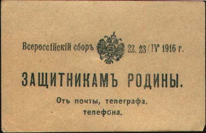 1916 г. 22.-23.04.1916 г. Всероссийский сбор. Разм. 69 х 45 мм. Одноцветная печать на тонкой желтоватой бумаге. В центре герб России. Текст: «Всероссийский сбор 22,23/IV 1916 г. Защитникам Родины от почты, телеграфа, теле-фона».