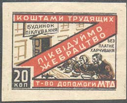 1932(?) г. Многоцветная печать на белой рыхлой бумаге. Текст на украинском языке: «Средствами трудящихся ликвидируем нищенство. Отделение общества Г[ородских] О[бществ] П[помощи]».