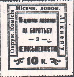 1927 г. 27.09.1927 г. Разм. рамки 36 х 40 мм. Одноцветная печать на белой бумаге. Зубц. 11 1/2. В центре в двойной прямоугольной рамке текст в четыре строки на украинском языке: «Общими силами на борьбу с неграмотностью». Внизу номинал. По внутреннему периметру рамки текст на украинском языке: «Окруж[ная]. Комиссия Месячн[ика]. Пом[ощи]. Ликбезу».