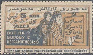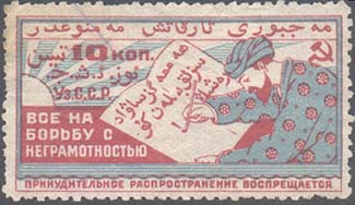 1926 г. Разм. рамки 50,5 х 27,5 мм. Двухцветная печать на белой бумаге. Зубц. 10 1/2. С клеем. В двойной прямоугольной рамке различные рисунки. Текст на русском и узбекском языке арабским шрифтом: «Все на борьбу с неграмотностью. Принудительное распространение воспрещается».
