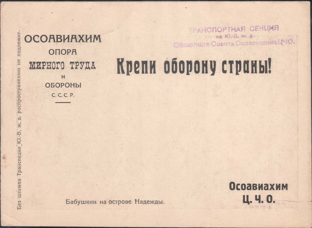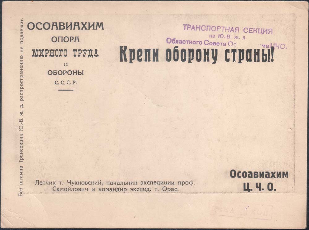 1931 г. Областной выпуск. Листок разм. 178 х 131 мм. Одноцветная двухсторонняя печать на толстой белой бумаге. На лицевой стороне в рамке разм. 163 х 100 мм репродукция фотографии. На оборотной стороне в левом верхнем углу текст в шесть строк: «ОСОАВИАХИМ опора мирного труда и обороны С.С.С.Р.». В правом верхнем углу текст: «Крепи оборону страны!». Слева вертикально снизу вверх мелким шрифтом текст: «Без штампа Трансекции Ю.-В. ж. д. распространению не подлежит». В левом верхнем углу фиолетовый оттиск ручного штампа с текстом в три строки: «Транспортная секция на Ю.-В. ж. д. Областного Совета Осоавиахима ЦЧО». В правом нижнем углу фиолетовый оттиск ручного штампа. В прямоугольной рамке разм. 37 х 8 мм текст: «Цена 20 коп.».