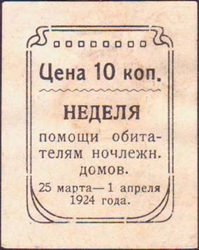 1924 г. 25.03. – 01.04.1924 г. Разм. 36 х 45 мм. Одноцветная печать на белой бумаге. В прямоугольной декоративной рамке сверху геометрический орнамент и номинал. В центре текст в четыре строки: «Неделя помощи обитателям ночлежн[ых]. домов». Внизу в две строки дата: «25 марта – 1 апреля 1924 года».