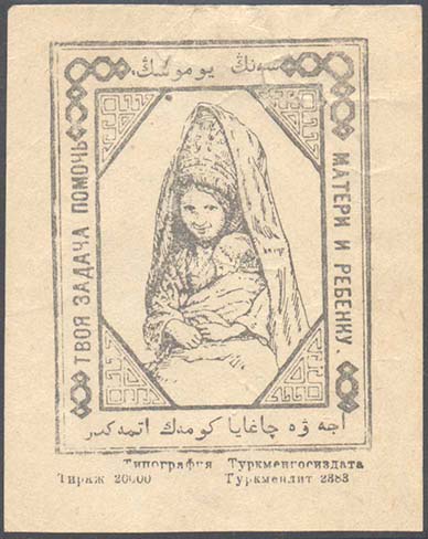 1925(?) г. Разм. 63 х 77 мм. Одноцветная печать на бумаге различных цветов и качества. В двойной пря-моугольной рамке разм. 48,5 х 62,5 мм в центре отдельной восьмиугольной рамке женщина в национальном костюме с ребенком на руках. По периметру между рамками текст на русском и местном языке арабским шрифтом: «Твоя задача помочь матери и ребенку».