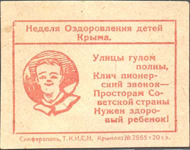 1924(?) г. Разм. 71 х 51 мм. Одноцветная печать на желтоватой бумаге. В прямоугольной рамке разм. 56 х 38 мм слева различные рисунки. Справа текст в восемь строк: «Улицы гулом полны, Клич пионерский звонок – Просторам Советской страны нужен здоровый ребенок!». Сверху текст в две строки: «Неделя оздоровления детей Крыма». Внизу под рамкой мелким шрифтом выходные данные.