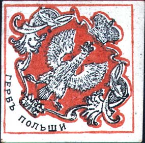1915(?) г. Ромб разм. рамки 42 х 42 мм. Двухцветная печать на плотной сероватой бумаге. В рамке в форме ромба в центре на красном фоне герб Польши. Внизу полукругом текст: «Герб Польши».