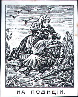 | Разм. рамки 48 х 59 мм. Сестра милосердия перевязывает раненого. Внизу под рамкой текст: «На позиции». | |||||