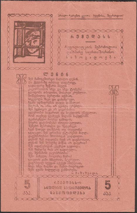 Листок разм. 118 х 184. Одноцветная печать на сероватой бумаге. В центре в декоративной рамке стихотворение Г.Гейне «Ткачи». Справа в рамке надпечатка нового номинала в виде текста: «25 копеек». На лицевой стороне фиолетовый оттиск круглой печати с текстом на грузинском языке.