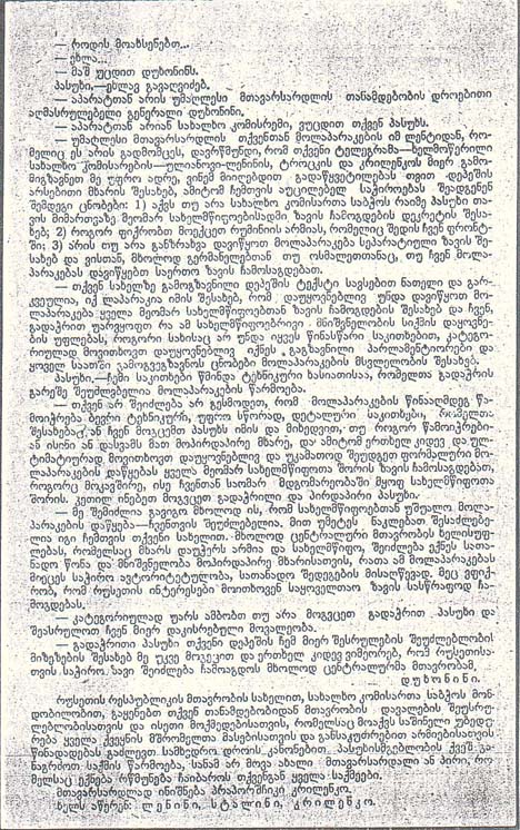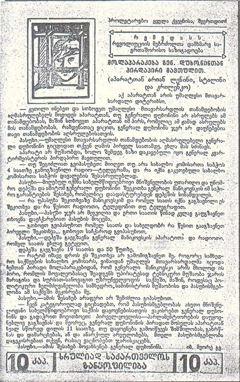 Листок разм. 119 х 187. Одноцветная печать на сероватой-оранжевой бумаге. Рис. аналогичен предыдущему. Все тексты на грузинском языке.