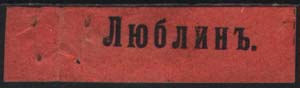 1915(?) г. Разм. ≈ 48 х 12 мм. Виньетки с названиями городов Царства Польского. Одноцветная печать на бумаге различных цветов.