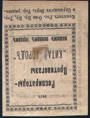 1915 г. 23.-26.06.1915 г. Разм. 49 х 75 мм. Одноцветная печать на бумаге различных цветов. В центре в декоративной рамке разм. 41 х 50 мм текст в пять строк: «На респираторы-противогазы «Китай Город нашим воинам героям»». Внизу под рамкой текст в две строки: «Комитет Рос[сийского]. О-ва Кр[асного]. Кр[еста]. Торгов[цев]. и Служащих Верх[них]. Торгов[ых]. Рядов».