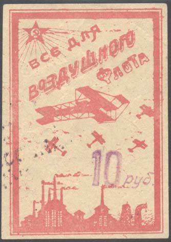 1923 г. Разм. рамки 50 х 74 мм. Одноцветная печать на желтоватой бумаге. В двойной прямоугольной рамке в левом верхнем углу пятиконечная звезда с лучами, ниже текст по диагонали в три строки: «Все для воздушного флота». В центре пять самолетов-бипланов над заводскими зданиями. На лицевой стороне …