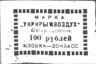1923 г. Разм. рамки 42 х 27 мм. Двухцветная печать на белой бумаге. В рамке из прямоугольников текст в четыре строки: «Марка «Укркрымвоздух» Юзокротделение. Юзовка - Донбасс».