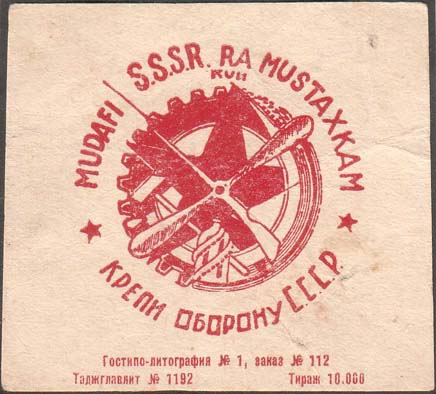1931 г. Разм. 72 х 65 мм. Одноцветная печать на белой бумаге. В центре эмблема ОСОАВИАХИМ. Слева и справа пятиконечные звезды. Внизу полукругом текст: «Крепи оборону С.С.С.Р.». Сверху полукругом текст на таджикском языке латинским шрифтом. Внизу мелким шрифтом выходные данные в две строки: «Гости…