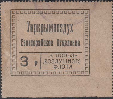 1923 г. Разм. рамки 45 х 35 мм. Одноцветная печать на бумаге различных цветов. Зубц. 11 1/2. В двой-ной рамке прямоугольной декоративной рамке сверху текст в две строки: «Укркрымвоздух Евпаторийское Отделение». Слева внизу номинал. Справа внизу текст в три строки: «В пользу Воздушного флота».
