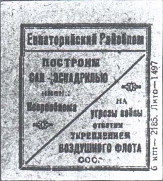 1930(?) г. Разм. рамки 72 х 46 мм. Одноцветная печать на желтоватой бумаге. В прямоугольной рамке самолет-биплан с летчиком в кабине, летящий вправо. Слева сверху текст в четыре строки: «Крепи военно-санитарную оборону страны С.С.С.Р.». Справа внизу номинал: «Цена 20 к.».