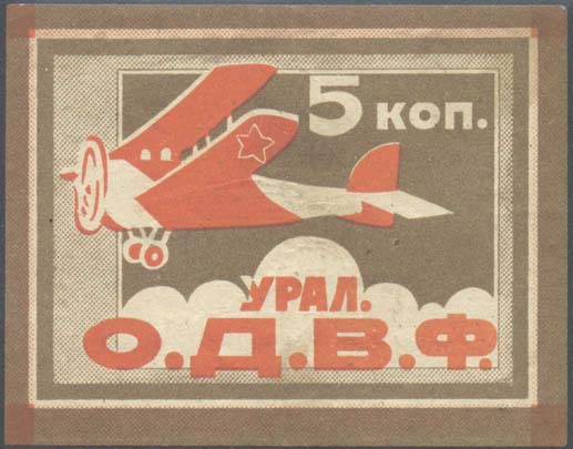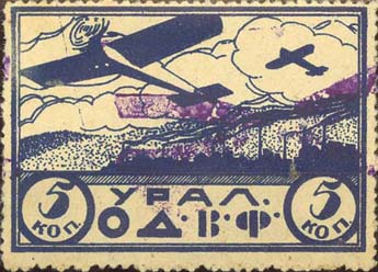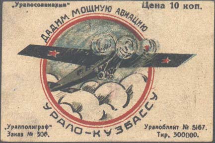 1924 г. Первый областной выпуск. Двухцветная двухсторонняя печать на белой бумаге. На лицевой стороне рисунок и номинал. На оборотной стороне в центре пятиконечная звезда, серп и молот. Сверху номинал. Ниже текст в две строки: «Трудовой народ, строй Воздушный Флот». Внизу текст в две строки: «Урал…