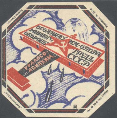 1930(?) г. Виньетка в форме восьмиугольника разм. 63 х 63 мм. Трехцветная печать на белой бумаге. В двойной восьмиугольной рамке самолет в облаках, сбрасывающий бомбы. На крыльях самолета пятиконечная звезда с серпом и молотом и текст в три строки: «ОСОАВИАХИМ – опора мирного труда и обороны СССР…