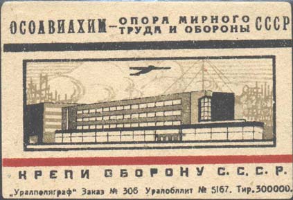 1932 г. Разм. 72 х 50 мм. Трехцветная двухсторонняя печать на желтоватой бумаге. На лицевой стороне в центре в прямоугольной рамке разм. 62 х 22,5 мм здание Дома Обороны. Сверху силуэт самолета в облаках. Сверху текст: «ОСОАВИАХИМ – опора мирного труда и обороны СССР». Внизу текст: «Крепи оборону…