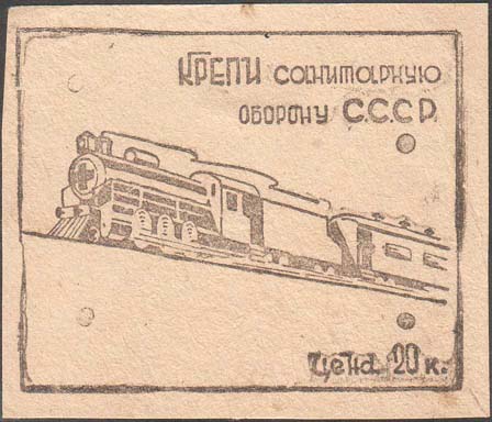 1931 г. Разм. рамки 67 х 54 мм. Одноцветная печать на сероватой бумаге низкого качества. В центре санитарный поезд. Справа сверху текст в две строки: «Крепи санитарную оборону С.С.С.Р.». Справа внизу номинал: «Цена 20 к.».