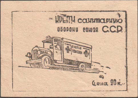 1933 г. Разм. рамки 67 х 42 мм. Одноцветная печать на сероватой бумаге низкого качества. В центре санитарная машина. Справа сверху текст в две строки: «Крепи санитарную оборону союза С.С.Р.». Справа внизу номинал: «Цена 20 к.».