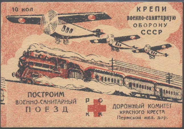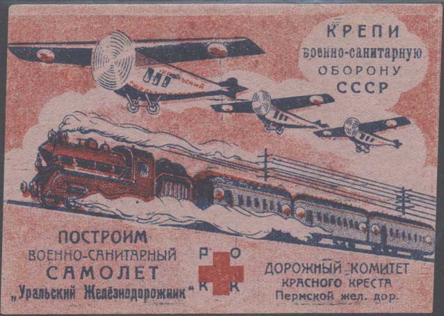 1931 г. Листок разм. 106 х 75 мм. Трехцветная двухсторонняя печать на бумаге различных цветов. На лицевой стороне в центре санитарный поезд и три санитарных самолета. На самолетах надпись: «Уральский железнодорожник». В правом верхнем углу текст в четыре строки: «Крепи военно-санитарную оборону С…