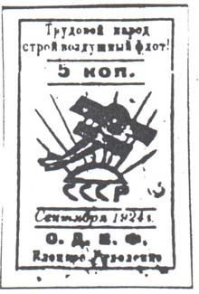1924 г. Сентябрь Разм. рамки 31 х 51 мм. Одноцветная печать на желтоватой бумаге. В центре в лучах восходящего солнца самолет-биплан, летящий вправо вверх. Под солнцем аббревиатура «СССР». Сверху текст в две строки: «Трудовой народ, строй Воздушный Флот!» и номинал. Внизу текст в три строки: «Сен…