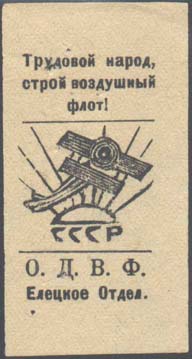 1924 г. Второй выпуск. Разм. 31 х 51 мм. Одноцветная печать на желто-ватой бумаге. В центре в лучах восходящего солнца самолет-биплан, летящий вправо вверх. Под солнцем аббревиатура «СССР». Сверху текст в три строки: «Трудовой народ, строй Воздушный Флот!». Внизу текст в две строки: «О.Д.В.Ф. Елец…