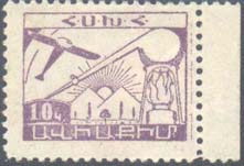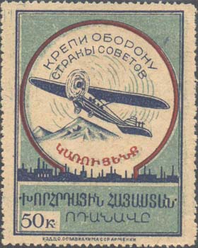 1933 г. Разм. рамки 40 х 53 мм. Трехцветная печать на белой бумаге. Зубц. 11 1/2. В рамке в круге самолет, летящий влево, гора Арарат и заводские здания. Сверху полукругом текст в две строки: «Крепи оборону страны Советов». Внизу текст на армянском языке в три строки: «Построим самолет «Социалист…