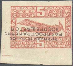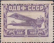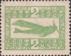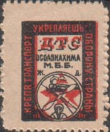 1931 г. Разм. рамки 17 х 23 мм. Зубц. 11 1/2. Трехцветная печать на желто-серой бумаге. В двойной прямоугольной рамке внизу эмблема ОСОАВИАХИМ. Сверху различные тексты в четыре строки. По периметру между рамками текст: «Крепя транспорт, ты укрепляешь оборону страны».