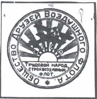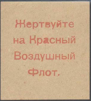 1923 г. Разм. 48 х 54 мм. Одноцветная печать на светло-желто-серой бумаге. В центре текст в четыре строки: «Жертвуйте на Красный Воздушный Флот».