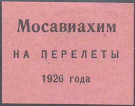 1926 г. Разм. 45 х 35 мм. Одноцветная печать на розовой бумаге. Текст в три строки: «Мосавиахим на перелеты 1926 г.».