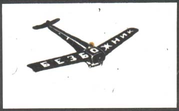 1928 г. Разм. 59 х 36 мм. Одноцветная печать на желтоватой бумаге. Самолет-моноплан, летящий вправо. На крыльях самолета надпись: «Безбожник».