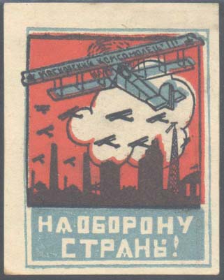 1933 г. Разм. рамки 45 х 57 мм. Трехцветная печать на белой бумаге. В прямоугольной рамке самолеты в облаках над городом. На крыльях одного из самолетов надпись: «Московский комсомолец». Внизу текст в две строки: «На оборону страны».