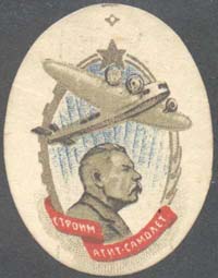 1933(?) г. Овал разм. 32 х 46 мм. Многоцветная печать с тиснением на плотной белой бумаге. В центре в обрамлении венка самолет в лучах солнца. Сверху пятиконечная звезда. Внизу портрет А.М.Горького в профиль. Внизу на ленте текст: «Строим агитсамолет».