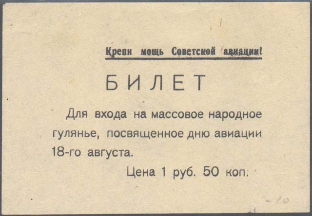 1947(?) г. Разм. 104 х 72 мм. Одноцветная печать на желтоватой бумаге. В центре текст в четыре строки: «Билет. Для входа на массовое народное гулянье, посвященное дню авиации 18-го августа». Сверху текст с подчеркиванием: «Крепи мощь Советской авиации!».
