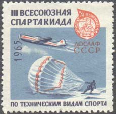 1965 г. Всесоюзный выпуск. Разм. по перфорации ≈ 37 х 37 мм. Многоцветная двухсторонняя печать на белой бумаге. Зубц. 11 1/2. На лицевой стороне различные рисунки, памятный значок и текст: «III всесоюзная спартакиада по техническим видам спорта. ДОСААФ СССР». На оборотной стороне текст в две строк…