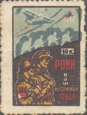 1932 г. Разм. рамки 23 х 32 мм. Многоцветная печать на бумаге различного качества. В центре слева на темном фоне юноша и девушка с повязками с красным крестом на рукавах. Справа номинал и текст в три строки. Сверху на холме цепь красноармейцев с винтовками наперевес. Сверху в небе на силуэт самол…