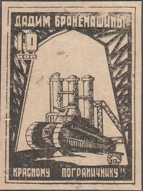 1932 г. Разм. рамки 45 х 61 мм. Одноцветная печать на бумаге различных цветов. В прямоугольной рамке арка из металлических конструкций. Под аркой танк на фоне заводских сооружений. В левом верхнем углу номинал. Сверху текст: «Дадим бронемашины». Внизу продолжение текста: «Красному пограничнику!».…