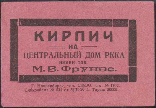 1926 г. 05.03.1926 г. Разм. рамки 72 х 36 мм. Одноцветная двухсторонняя печать на розовой бумаге. На лицевой стороне в толстой прямоугольной рамке в центре текст в пять строк: «Кирпич на Цен-тральный дом РККА им. тов. М.В.Фрунзе». Внизу мелким шрифтом выходные данные: «Г. Новосибирск, тип. СибВО. …
