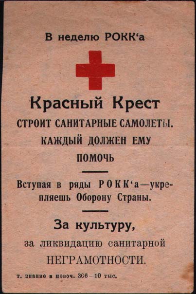 1930(?) г. Разм. 68 х 102 мм. Двухцветная печать на бумаге различных цветов. Сверху текст: «В неделю РОККа». Ниже красный крест и текст в четыре строки: «Красный Крест строит санитарные самолеты. Каждый должен ему помочь». Ниже текст в две строки: «Вступая в ряды РОККа – укрепляешь Оборону Страны…