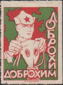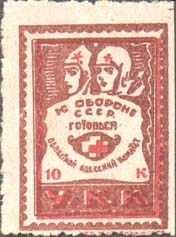 1932 г. Разм. рамки 25 х 35 мм. Двухцветная печать на бумаге различных цветов и качества. Нерегулярная зубц. В центре сверху головы красноармейца и санитарки. В центре на картуше красный крест и текст на украинском языке в четыре строки: «К обороне страны готовься. Одесский областной комитет». Вн…