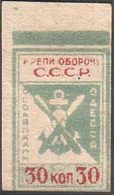 1932 г. Разм. и рис. аналогичны предыдущему выпуску. На оборотной сторон фиолетовый штамп с текстом в три строки: «Зап[адно].-Сиб[ирский]. Крайсовет Осоав[иахима]. 10 к.». (О).
