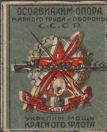1931 г. Разм. рамки 52 х 64 мм. Многоцветная печать на плотной сероватой бумаге. В прямоугольной рамке на сплошном фоне в центре эмблема ОСО-АВИАХИМ и силуэт эсминца. Сверху текст в три строки: «ОСОАВИАХИМ – опора мирного труда и обороны С.С.С.Р.». Внизу текст в две строки: «Укрепим мощь красног…