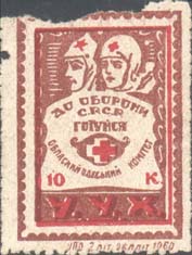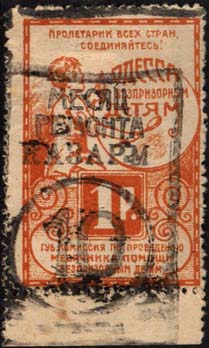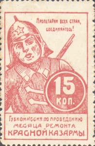 1923 г. Разм. рамки 29 х 44 мм. Одноцветная печать на белой бумаге. Зубц. 11 1/2. В прямоугольной рамке красноармеец с винтовкой за плечами. Справа в двойной круглой рамке номинал. В правом верхнем углу текст в две строки: «Пролетарии всех стран, соединяйтесь!». Внизу текст в три строки: «Губкоми…