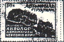 1932 г. Разм. рамки 62 х 37 мм. Трехцветная печать белой бумаге. Нерегулярная зубц. В центре два автомобиля с красноармейцами в кузове, едущие по мосту. В правом верхнем углу текст в две строки: «Автомобиль трудящимся» и номинал. В левом нижнем углу текст в четыре строки: «Укрепляя АВТОДОР помога…