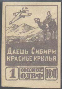 1924 г. Разм. рамки 28 х 40 мм. Одноцветная печать на белой бумаге. Зубц. 11 1/2 и Б.З. В центре самолет-моноплан летящий вправо на фоне гор, отара овец и всадник на верблюде. Ниже текст в две строки: «Даешь Сибири красные крылья». Внизу текст в две строки: «Омское ОДВФ» и номинал.